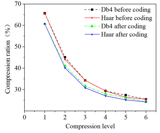 - After wavelet decomposition based on the DB4 and the Haar wavelet basis, data compression is slight. It can be seen that some redundant information in the data has been compressed during wavelet decomposition, resulting in small changes in the amount of re-compressed data during coding;