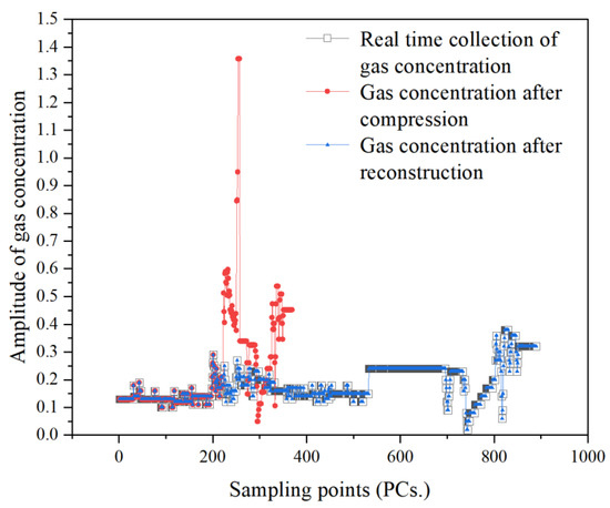It can be seen from the experimental results that under the complex channel characteristics, the response of data compression is obvious, and the compression level responds three times. Under good channel characteristics, the signal data can be transmitted completely. The data can be compressed at the corresponding level if the channel changes. In the compression of each part, the channel characteristics are reasonably used. In complex channels, the compression ratio of the original signal reaches 74%. The data are further compressed to a 68% compression ratio through the coding algorithm, reducing the data complexity. As shown in Figure 12, the data after signal reconstruction are slightly different from the original data. At this time, the reconstruction effect error is 2.9580 × 10−15, which is between 2~3 levels of fixed wavelet series compression. Therefore, the self-derived wavelet decomposition algorithm is more suitable for the underground wireless transmission characteristics of the coal mine, resulting in significant data loss and distortion, negatively impacting real-time monitoring in underground coal mine production sites. This has a negative impact on the real-time monitoring of underground production and poses a significant risk to coal mine safety.