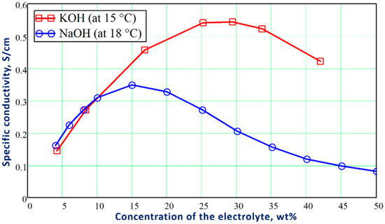 where α is the dissociation degree of the diluted electrolyte, c is the molar concentration of the electrolyte , and are the electrical mobilities of cations and anions, respectively , F is the Faraday constant, . Since potassium cations K+ have higher electrical mobility than sodium cations Na+ ( for K+ cations versus for Na+ cations [28]), the KOH aqueous solution has higher specific conductivity at the same concentration compared to the NaOH aqueous solution, as can be seen in Figure 1.