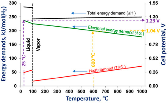 Figure 3 also shows values of the cell potentials needed to be applied for the water decomposition at 25 °C and 600 °C. At 25 °C, the cell potential is 1.23 V, whereas at 600 °C, which corresponds to the steam electrolysis, the cell potential is 1.04 V. These values are found as the projections of the intersection points of isotherms (vertical dashed lines in Figure 3) of 25 °C and 600 °C with the electrical energy demand line (ΔG) to the cell potential axis (right-hand vertical axis). Practically, in the high-temperature water/steam electrolysis, the potential of the electrolytic cell can be reduced below 1 V [34,35].