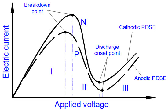 Figure 5 shows typical shapes of the current-voltage characteristics I(V) of the electrolysis comprising the Faradaic, transition, and PDSE phases. The current-voltage characteristics are shown for two cases: when the smaller electrode is positively (marked P) or negatively (marked N) charged. The case of a positively charged smaller electrode terminates with the anodic regime of PDSE, whereas the case of a negatively charged smaller electrode terminates with the cathodic regime of PDSE. Although the I(V) characteristics differ, they have similar shapes, and each has two extremum points, which divide the electrolysis into three phases (Figure 5). The first phase (marked I) is the Faradaic electrolysis. It ends at a breakdown point when the Faradaic electrolysis terminates due to the formation of a stable gas–vapor envelope around the discharge electrode due to the coalescence of gas and vapor bubbles. The gas and vapor bubbles are produced by the Faradaic electrolysis and by evaporation of the electrolytic solution, especially at higher electric current densities, causing higher Joule heating. The value of the electric current density at which the Faradaic electrolysis terminates (i.e., at the breakdown point) depends on the material of the discharge electrode, conductivity of the electrolytic solution, temperature, and surface tension [10].