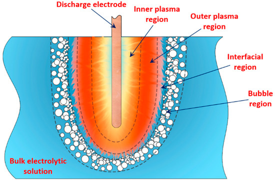 The studies of the formation of PDSE in the electrolytic solution [10,18,19,20,21] showed that several processes must occur before the plasma is induced at the electrode surface. They are the Faradaic electrolysis, the Joule heating of the electrolytic solution, the solution evaporation at the electrode, the ionization of the gas–vapor mixture within the limited volume (called the envelope) around the discharge electrode, and eventually, the electrical discharges across the envelope.