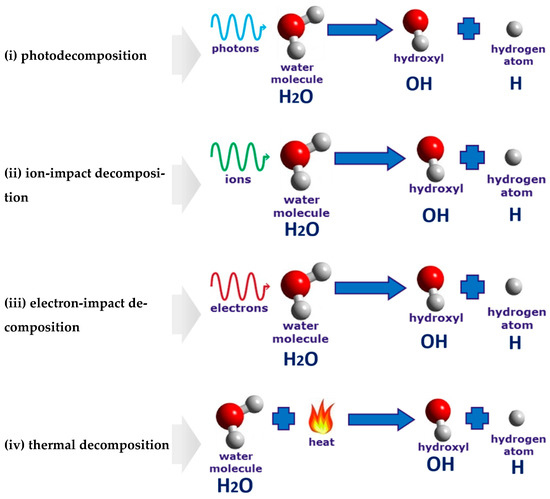 According to [49,50], four different processes are responsible for the decomposition of the water molecules in the vicinity of the discharge electrode. They are (i) photodecomposition, (ii) ion-impact decomposition, (iii) electron-impact decomposition, and (iv) thermal decomposition (Figure 7).