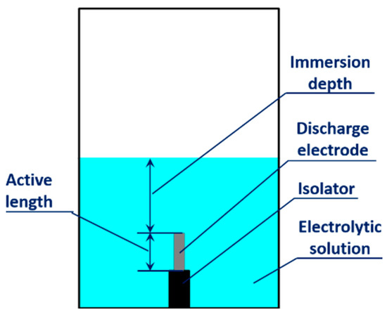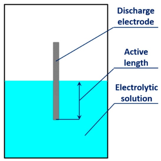 Regardless of the electric potential polarity, the plasma is formed at the electrode, which its active surface area (immersed in the electrolytic solution) is smaller than that of the other electrode. The electrode at which the plasma is formed is called the discharge electrode [36]. If the smaller electrode is positively charged (being an anode), the discharge formed around it is called the anodic glow discharge. If the smaller electrode is negatively charged (being a cathode), the discharge around it is called the cathodic glow discharge (see Figure 4). Correspondingly, PDSE is either the anodic or cathodic regime of PDSE. The length of electrodes exposed to the electrolytic solution is called the active length of the electrodes.