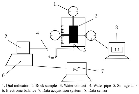 The device shown in Figure 1 is used to simulate the water absorption process of mudstone samples. Since the device is based on the principle of water absorption test with a U-shaped tube, the water surface of the water storage tank and the water contactor shall be consistent before the test. The rock sample is placed in the water contactor to absorb the water in the water contactor under the action of the capillary. Water reduced by the water storage tank is equal to the water absorbed by the rock sample. The reduction rate of the water storage tank is read into the computer through an electronic balance, and the micrometer is used to measure the deformation of mudstone during water absorption.