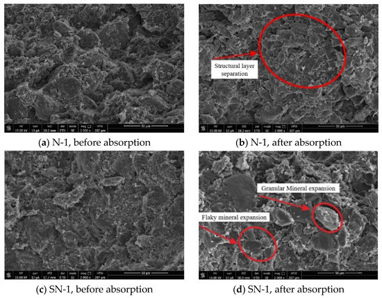 From Figure 3, it can be seen that after water absorption, the pores will become larger due to the loss of fillers in the pores and on the boundary of the pores. Meanwhile, the pores and fissures will be gradually squeezed with the effect of mineral volume expansion, resulting in the reduction in fissures and pores between mudstone minerals and minerals. Additionally, with the expansion of lamellar minerals, the water-absorbing film between mineral layers thickens, leading to the increase in spacing, resulting in the separation between layers. Then, the whole structure is destroyed.