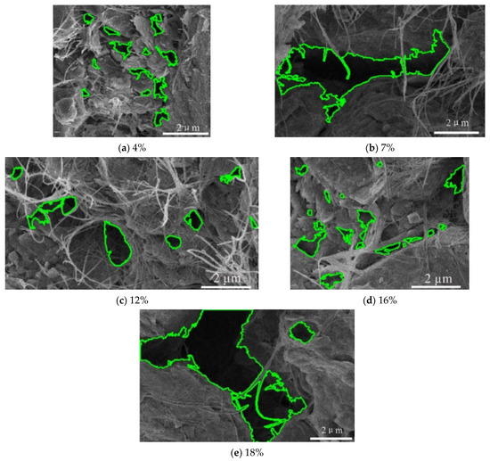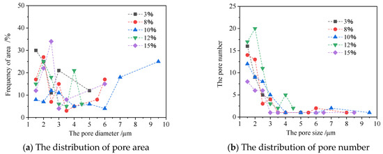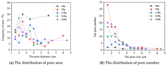 The distribution pattern of the pore area is seen in Figure 5a. When the water content grew to 7%, the mudstone derived pores of other grain sizes. The mudstone pores studied in this paper mostly belong to clay matrix pores, microporous type, and the pore ranged are all between 1–9 μm. No sudden appearance of large pores occurred during the whole water absorption process. With water content increasing, the pore size of large grains slightly decreased, which was due to the expansion of clay minerals and the filling of pores by the expansion volume. At 18%, the pore range was further expanded, which was then due to the thickening of the water film of clay minerals, the possibility of further enlarging the pore size between pores, and the derivation of new pores.