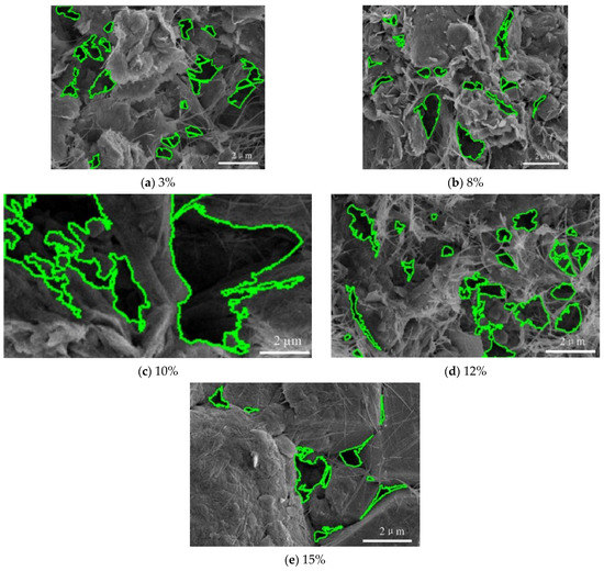 Figure 7 shows that after the water content increased to 8%, the number of pores in the mudstone did not change much. When the water content of the mudstone increased to 10%, the number of large-size pores increased due to the dissolution of soluble material around the pores, making the pore size large. The clay minerals started to swell with the entry of water, and the swelling volume squeezed the pores at the water content of 12%, and the number of large-size pores decreased. The clay minerals continue to swell and squeeze the pores, thus reducing the number of pores.
