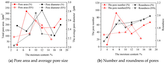 Figure 8 shows the main pore characteristics parameters of N-type and SN-type mudstones under different water absorption conditions. N-type mudstone has a lot of pores at low water content. The structure of N-type mudstone is loose after water absorption, and the pore area and quantity are high. When the water content is low, the pore area and the number of SN mudstone are small and increase with the increase in water content. In terms of roundness, the trend of N-type mudstone and SN-type mudstone was the same, both tend to be close to 2. This is because, with the water absorption, the clay minerals continued to expand and squeeze the pores.