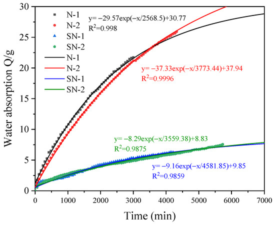 The water absorption was plotted against time, and the water absorption characteristic curves of the mudstone samples N-1, N-2, SN-1, and SN-2 were obtained by fitting as shown in Figure 9. The R2 of samples N-1, N-2, SN-1, and SN-2 were 0.9859, 0.987, 0.998 and 0.9996, respectively, indicating a good fitting effect.