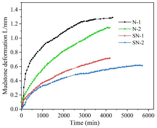 From Figure 10, we can see that the changing trend of water absorption deformation (dL/dt) of N-type mudstone is larger than those of SN-type mudstone. The clay mineral content of N-type mudstone is high, which expands and deforms more for the same rock surface area.