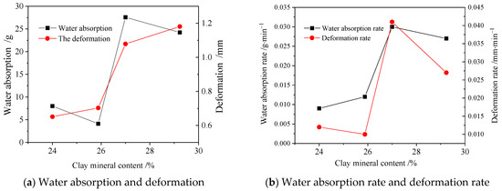 The volume of clay minerals will increase significantly after water absorption, for example, illite will increase the original volume by 50~60% after water absorption, so the influence of the amount of clay minerals on water absorption and deformation cannot be ignored [29,30]. The relationship between clay mineral content and final water absorption and final deformation at the end of experiments is shown in Figure 11a.