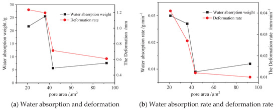 From Figure 12a, a greater connection between pore area and water absorption and deformation of mudstone exists, leading to larger water absorption. Then, the clay particles can fully absorb water molecules, and the water film thickens, resulting in larger particle-to-particle spacing and larger deformation.