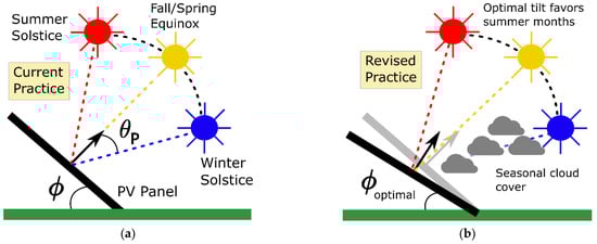 (a) A depiction of a commonly accepted practice for deploying PV panels, where the tilt angle is equivalent to the latitude of the PV panel geographic location. (b) A revised practice where the PV tilt angle is revised to reflect seasonal weather patterns and seasonal variations in daylight hours.