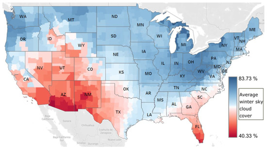 Average cloud cover during the winter in percent for every county in the continental United States.