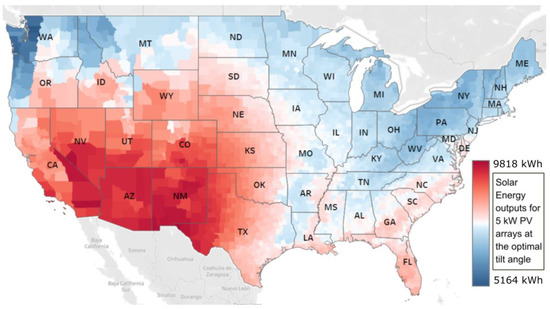 Solar energy output in kWh for 5 kW arrays in the continental United States.