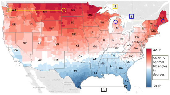 Solar PV optimal tilt angle in degrees for every United States county, showing locations of interest where optimal tilts differ at similar latitudes. The circles connected with lines, labeled with the boxed values 1, 2 and 3, indicate counties of similar latitude that are used for comparison cases.