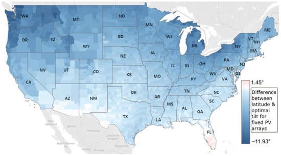 In conclusion, the optimal tilt angle of an array depends on the location latitude as well as the local ambient temperature and cloud cover patterns. Discrepancies by as much as 12° are found between the optimal tilt angle and the latitude angle, with 77% of counties having a difference of 2° or more between the optimal tilt angle and the location latitude.