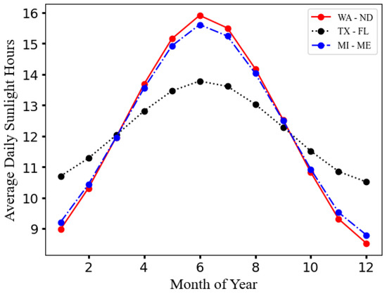 As seen in Figure 6, most locations favor collection during summer months. Further, Figure 6 indicates that the higher north a location is, the more it favors collection in the summer. Further, as shown in Figure 7, locations at higher latitudes have a large increase in the number of daylight hours when compared against winter daylight hours, going from 9 h in the winter to 16 h in June, gaining about 7 h of additional daylight. Lower latitude locations gain about 3 h during the summer, varying between 11 h in the winter and 14 h in the summer. Increased daylight hours provide additional solar irradiation for power production, causing the optimizer to favor collection during summer months.
