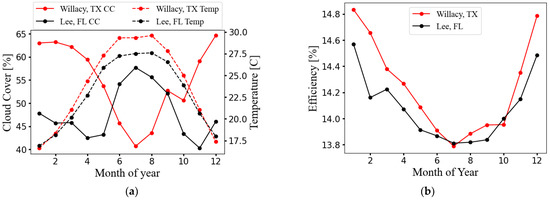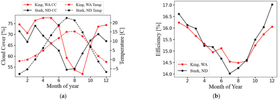 (a) Comparison of seasonal cloud cover and ambient temperatures for case 1 indicated in Figure 5. (b) The temperature-dependent efficiency of PV panels for case 1 locations.