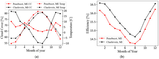 In case 2, Penobscot County in Maine is compared to Charlevoix County in Michigan. A visual location comparison is shown in Figure 5. The optimal tilt in Charlevoix is 35° (Latitude = 45.51°), where the optimal tilt in Penobscot is 40° (Latitude = 45.39°). A higher tilt angle corresponds to more solar collection during the wintertime, while a lower tilt angle corresponds to increased collection in the summertime. In this case, Michigan has lower cloud cover during the summer months, and higher cloud cover during the winter, as shown in Figure 9a, indicating a greater solar availability in the summer months when compared with Penobscot County. This would explain why the optimal PV tilt angle in Charlevoix County favors summer months more than Penobscot County. This is also shown in Figure 2, where the northern counties in Michigan have more cloud cover in the winter than the state of Maine. Figure 9b shows Charlevoix County is the more efficient location since there is much less cloud cover than Penobscot County.