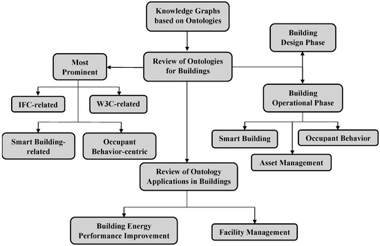 This section briefly introduced the field’s main issues and current situation. Section 2 provides information about the knowledge graphs and their connection with the DTs, in addition to the adoption of semantic web technologies and KGs to solve the stated data problem. Next, in Section 3, the methodology of this review paper is described. In Section 4, the existing ontologies for buildings are presented and, in Section 5, some of their applications are introduced. Section 6 presents a discussion based on the findings and, in Section 7, the conclusions of this paper are presented. In Appendix, Table A1 contains all the abbreviations that are mentioned in this review.