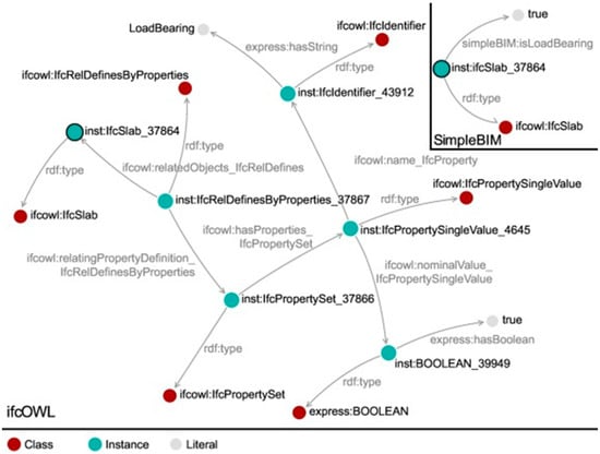 To every entity, an IFC schema gives spatial properties, and various other properties that are classified. ifcOWL is a complex ontology language, which is a translation from the IFC schema through the EXPRESS data modeling language into an OWL representation [21,75]. The complexity is shown as a property set that assigns the properties using relational nodes. Two intermediate nodes are needed to insert the name and the value of the property. The EXPRESS datatype is used to express literals. SimpleBIM is an attempt to simplify this ifcOWL as it uses the most straightforward approach. Figure 5 shows the difference between them, as they represent the same entities. SimpleBIM also uses the Turtle serialization format for RDF data models [76].