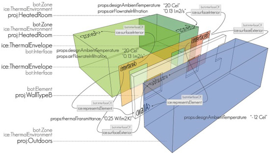 Visualization of the AEC-KG model for the heat-loss calculation case study [74] (Reprinted from Elsevier Automation in Construction, Volume 108/December 2019, 102956, Mads Holten Rasmussen, Maxime Lefrançois, Pieter Pauwels, Christian Anker Hviida Jan Karlshøj, “Managing interrelated project information in AEC Knowledge Graphs”, Pages No. 4 and 13, Copyright (2019), with permission from Elsevier [OR APPLICABLESOCIETY COPYRIGHT OWNER]).