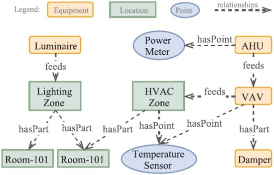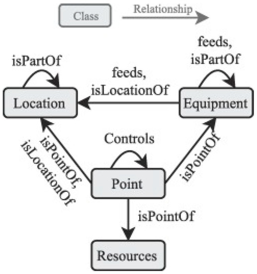 The first smart building-related ontology to be discussed is Brick [131]. Brick’s main goal is concentrated on metadata and data points from building advancement and needs. These data points are based on end-use applications and consist of the main ontology that establishes the core concepts and the connections between them, in addition to a typology that enlarges the building’s concepts [95]. Brick is a schema that addresses the problem of heterogeneity of building representation, and adds a quick and non-costly reaction to energy efficiency measures [132]. The concept of tags is adopted, based on Project Haystack, to add a more flexible means to annotate metadata. Then, these tags are altered with an ontology that boosts its concepts, creating a framework that establishes hierarchies, relationships and properties that are mandatory for building metadata [95,133]. Furthermore, using an ontology provides the schema with the ability to manipulate the metadata using common tools. In the Brick schema, the tagset concept is introduced, which groups tags with similar properties [132]. In Figure 7, the information concepts and the relationship to a data point are shown. Relationships are qualities that connect a point with other classes, with the major classes being the Location, the Equipment and the Measurements, also shown in Figure 8, as well as their subclasses Figure 9 depicts the example building. Base on this building, Figure 10 shows the relationships of it and it is understood that it represents an early visual of a KG. Brick models are making it easier to represent some subsystems in buildings, as they bypass their complex and heterogeneous character, and support the composition and hierarchies in the building [95]. Furthermore, Brick also stands out due to its ability to access open reference implementations on existing buildings, in order to authenticate the effectiveness of the solution [95].