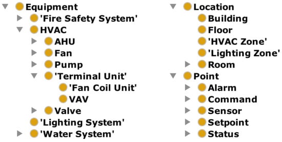 Haystack Tagging Ontology (HTO) is an “open-source initiative to streamline working with data from the Internet of Things”, based on Haystack [94]. Haystack is responsible for terminology and instance data representation. Its primary purpose is semantic data representation using depositories of name and value relations [134]. These names are called Tags and are used to describe instance data. The name–value pairs mentioned previously are called Defs, and the repositories are called libraries, where a group of them is utilized to describe instance data [134]. HTO is based on Haystack and utilizes semantic web technologies and organizes the tags’ usage in parallel to enriching the current ontology [120]. HTO’s structure is similar to the Brick ontology, and consists of site, equipment and points classes, which are also connected with an external weather class [19]. The tags are utilized to connect properties and product classes with any entity in the building structure [19].