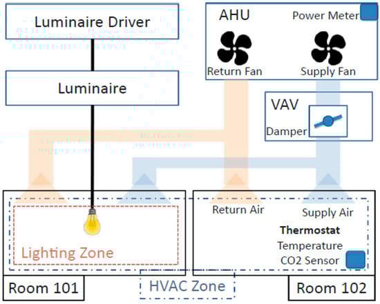 A simple example building that highlights the components to be modeled in a building schema [132] (Reprinted from Elsevier Applied Volume 226, Bharathan Balaji, Arka Bhattacharya, Gabriel Fierro, Jingkun Gao, Joshua Gluck, Dezhi Hong, Aslak Johansen, Jason Koh, Joern Ploennigs, Yuvraj Agarwal, Mario Bergés, David Culler, Rajesh K. Gupta, Mikkel Baun Kjærgaard, Mani Srivastava, Kamin Whitehouse, Brick: Metadata schema for portable smart building applications, Pages No. 1273–1292, Copyright (2018), with permission from Elsevier [OR APPLICABLESOCIETY COPYRIGHT OWNER]).