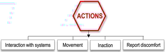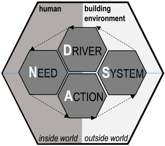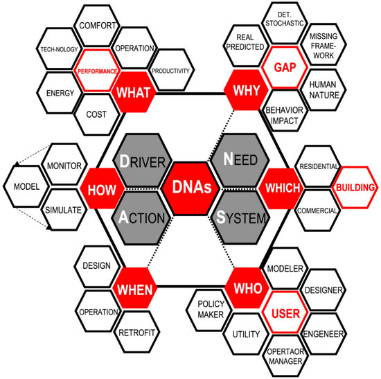 DNAs Framework is a powerful approach to represent the impact of occupants’ behavior on the building’s energy efficiency [112]. It separates that impact into four components, i.e., drivers, needs, actions and systems, which comprise the outside and inside world (see Figure 11). Drivers are the environmental elements that impact the occupants’ psychological or physical needs in the inside world. The categories of this topology include building (component, properties, location), occupant (attributes, attitudes, location, state), environment (climate, indoor, outdoor, weather), system (properties, state) and time (day, week, month) (Figure 12). Needs refer to the physical and non-physical necessities to satisfy the occupants in the inside world. Physical needs refer to biological needs (food, drink, bathroom, hygiene, sleep) and the need for comfort (thermal, acoustic, visual, IAQ) (Figure 13). Actions refer to the interactions between the occupant and the systems or activities in which an occupant can participate to change environmental comfort. These actions are interactions with the systems, movement, and reporting discomfort or inaction. Finally, systems refer to equipment or mechanisms an occupant can interact with to change environmental comfort (Figure 14). These systems are windows, shades/blinds, lights, thermostats, space, equipment, clothing and prompts/feedback (Figure 15). The overall field of DNAs Framework’s applications addresses questions regarding the types of behaviors it covers, why this framework is valuable, in which types of buildings it can be applied, who can use it, when it can be used and how it can represent energy-related behavior (Figure 16).