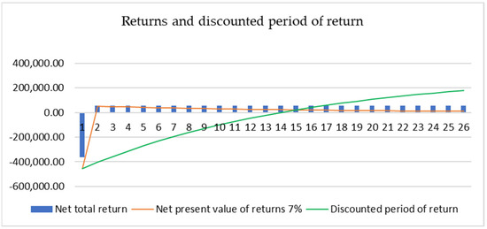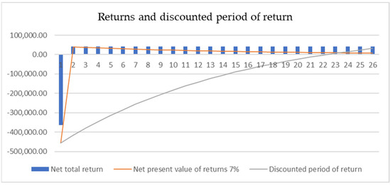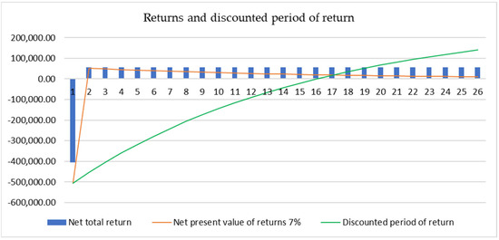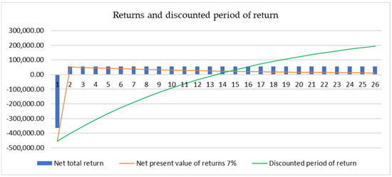 The financial indicators (Table 9) show the unacceptability of the investment, as the NPV is 43,026.82 € and the DPP is more than 25 years. Only a 10% increase in incomes would raise the NPV to 63,409.05 € and the IRR to 11.40% (Figure 11).
