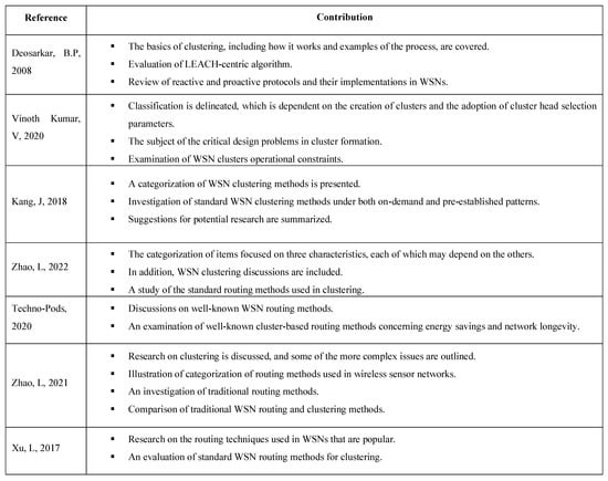 While selecting CHs, prior research has overlooked routing strategies, as discussed in Section 2. As a result, the selection of CHs, routing configuration, and communication failures becomes ineffective. The overall cluster count decreases after extending the deployed node transmit power [36]. The standard benchmark protocols [15] also do not make use of any routing strategy. As a result, the multi-path routing method is implemented in the proposed article, where the present CH looks for another nearby CH with half of its transmission distance. The newly chosen intermediate CH node serves as a data forwarder to the sink or BS. Figure 3 shows below as Contributions of previous surveys on clustering and routing protocols in WSNs.