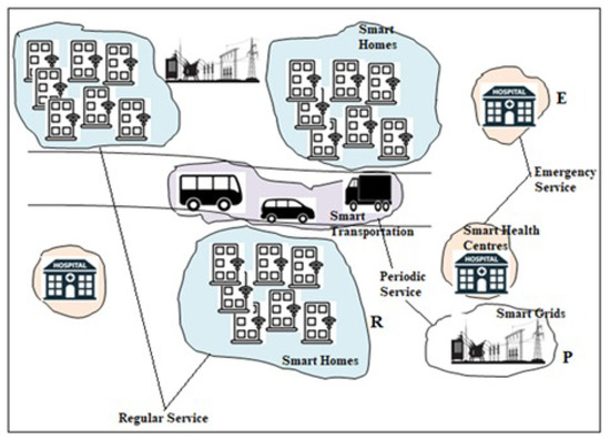 To study the scenario in this research, we are assuming a deployed WSN that comprises all of the sensor nodes of various services, randomly dispersed in a coverage region (presumed smart area). Essential data sinks or BS are also considered in the sensing area. After the fixture of all sensing nodes and the required BS, they are presumed to be immobile. Furthermore, we categorize the heterogeneity of the sensor nodes based on their services in a smart environment. They are regular (R), periodic (P), and emergency (E) services, which means they do not have equivalent abilities, such as reception/transmission range, processing, energy capability, and so on. By optimizing energy utilization, sensor nodes may employ power management to regulate the data transmission power level that depends entirely on the receiver’s distance [40,41]. Wireless connections are preferred for all communications. Communication is established among various deployed nodes only if the interested nodes are within the reachable, communicative range of others. In this model, because the transmitting power is predefined, each node can determine the distance of its neighbors based on the Minkowski metrics.
