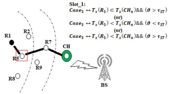 The reactive and proactive routing procedures begin at intra-level and inter-level clustering once the BS sends updated routing information throughout the smart city environment. Whenever the particular nodes’ transmission exceeds the predefined time slot, it can route the excess data packets through known 1-hop or 2- hop communicative nodes. Similarly, with the CH, the aggregated sensor data are routed during their allotted time slots, and if the transmission process exceeds the time limit, the excess packets are routed through the nearby CH identified at session. The three intra-cluster routing strategies cases are depicted in Figure 6, Figure 7, Figure 8, Figure 9, Figure 10 and Figure 11.