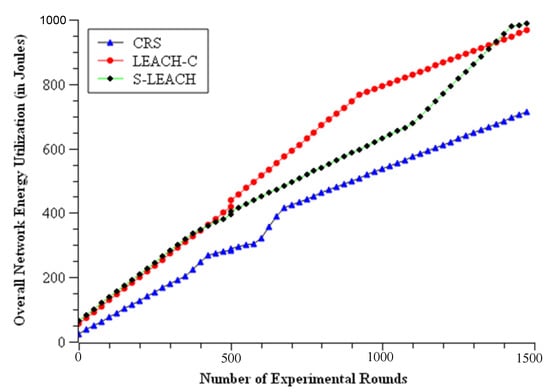 Overall energy utilization vs. experimental rounds (inter-cluster level).