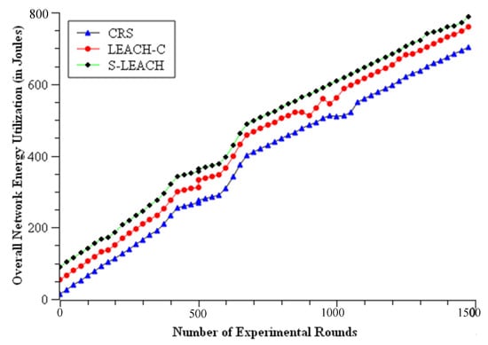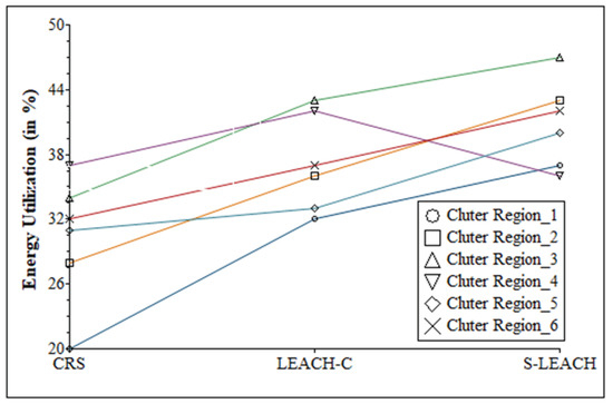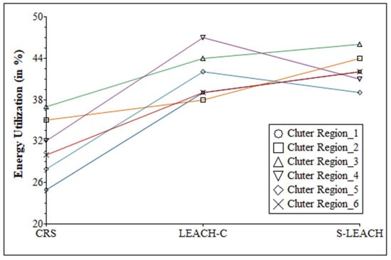 Figure 18 illustrates the throughput in homogeneous routing at the intra-cluster level and heterogeneous routing at the inter-cluster level. When compared to S-LEACH and LEACH-C, CRS is also shown to provide better throughput. This is because each cluster is segregated based on service type and process specific to similar data types. Moreover, unless the transmission data packets of the nodes exceed the time slot, it is presumed to transmit its sensor data to the corresponding CH directly. Thus, the overall delivery of packets with minimal loss is an application through the proposed protocol. Residual energy and connection level are primary factors in attaining an optimum throughout. The CH is randomly chosen among active nodes in S-LEACH with no parameter/criteria. Another significant issue is that all nodes are assumed to prefer only zero-hop communication (direct communication) in LEACH. Thus, it is not realistic and suitable for large-scale infrastructure.
