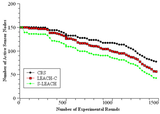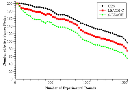 The experiments were conducted by varying the network size based on two scenarios, where scenario-1 constitutes 2:6:150 [BS: CH: mn] propositions of nodes and scenario-2 includes 4:8:200 [BS: CH: mn]. Furthermore, Figure 16 and Figure 17 demonstrate that, throughout the case of CRS, the sensing node survival rate is much higher than that of S-LEACH and LEACH-C. Thus, our suggested approach is successful for massive network deployments.