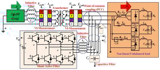For a stable and improved performance at the generation [8], distribution [9], and transmission [10] sectors, the above nonlinearity and PQ issues must necessarily be addressed. As a solution, conventionally, electromechanical devices such as tap changing transformers [11], passive filters [12], and synchronous condensers [13] are used to solve the PQ-related problems. Generally, passive filters are widely chosen due to their simple design and lower cost. However, conventional passive filters cannot eliminate the harmonic/non-linearity due to an increase in size, fixed reactive power supply and improper tuning of the resonance, etc. [13]. As a solution, power electronic-based devices like the dynamic voltage restorer (DVR) [14], shunt and series active filter [15], static compensator [16], and unified power quality controller (UPQC) [17] are widely selected to resolve the PQ related problems. Still, due to the requirement of excess power electronic switches and fixed compensation, shunt active filter (SAF)-based voltage source inverters (VSIs) are selected for simple design, economy, and better performance [18]. In addition to that, SAFs are used to eliminate the harmonics/non-linearity through a variable frequency and reactive power supply [19]. However, this type of filter integration is only feasible for 33W system applications, and the performance is affected due to the excess circulating current present in the system [20,21]. In a practical system, the role of a neutral current path is very important: to protect the system from sudden surges or transient conditions [22]. In [23,24], a four-leg SAF-based VSI is chosen for 34W system applications and facilitates a neutral current path to eliminate the circulating current. However, to get optimal performance in terms of reduced switching loss and proper switching signal generation, finding a better and more robust control technique for four-leg SAFs is necessary [25]. Therefore, to overcome the above shortcomings, there is a requirement to find novel control strategies for reducing the switching losses, circulating current, and harmonics obtained from the non-linear load.