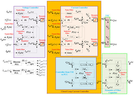 During the switched-on conditions of VSI, the open-loop VSI current control model is designed by using Kirchhoff’s voltage law (KVL) and represented in the component. The following equations are represented in the frequency domain. Frequency domain analyses are used to convert differential equations into simple algebraic equations [47,48].