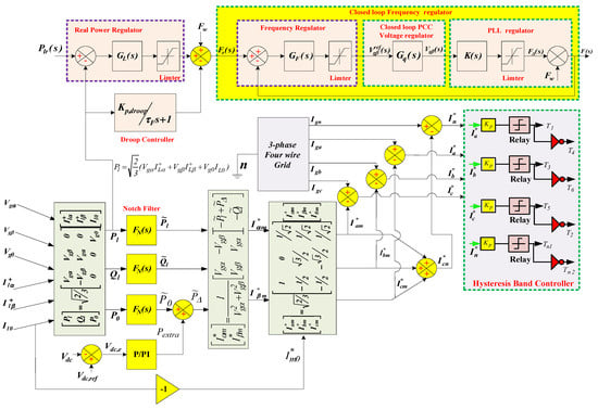 Due to the excess non-linear/unbalanced load and 34W-SAF applications, the proposed NCVC controller is restructured and named a novel harmonic cancellation technique (NHCT). The proposed NHCT control architecture is illustrated in Figure 3. The main aim of designing the proposed NHCT controller is to reduce the circulating current present in the system and improve the PQ significantly. The obtained and from the NCVC approach are considered in designing the proposed NHCT architecture. Therefore, by using the voltage (, , and ) and current (, , and ) components, the instantaneous active power (Pl), reactive power (Ql), and extra power (P0) are computed and represented as