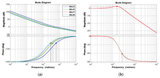 Equation (21) indicates that is a second-order transfer function. From the above closed-loop transfer function, the damping ratio () and bandwidth () are computed as follows.