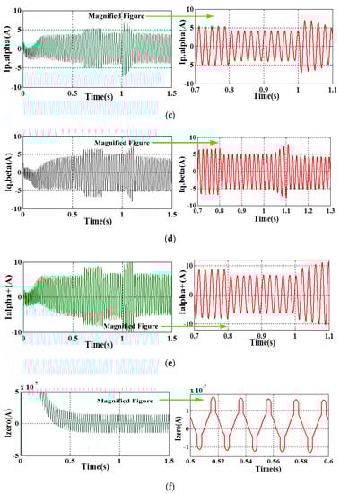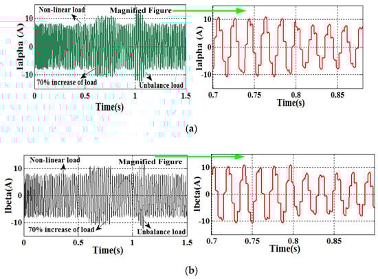 To study the performance of filters such as a notch, noise, and capacitive filters, the related component performance is studied. The related components are obtained from the internal controller design section. These outcomes are obtained from the internal controller design and guaranteed the significance of the required design in practical application. The performance of the proposed approach is studied by changing the non-linear load condition. As stated in Figure 2 and Figure 3, the outputs of the proposed approach are illustrated in Figure 6a–e. Figure 2 is only proposed for 3φ3W operations, and Figure 3 is proposed for 3φ4W operations. In the proposed approach, during 0–0.6 s, a 3φ balanced load is connected to the system. During 0.6–0.8 s, the load is suddenly increased to 70% of its initial loading. During 0.8–1 s, the load current returns to its original position. During 1–1.1 s, to make the load unbalanced, an RL load is connected to phase a of the non-linear load. During this condition, only the controller action is studied at each step. As illustrated in Figure 6a,b, the three-phase non-linear load current () is transformed to the αβ current component. Figure 6a,b shows that the αβ load current components () are non-linear. The non-linear load current affects system performance. For eliminating the non-linearity, is passed through a notch filter to extract the active and reactive linear load current ( and ) components as stated in Figure 6c,d. As shown in Figure 2, by taking all the grid and load data, the linear current components ( and ) are computed. The results of are illustrated in Figure 6e. In this proposed approach, for 3φ4W application, the regulation of neutral current magnitude is also important. Therefore, the computed reduced neutral current magnitude result is illustrated in Figure 6f. Due to the lesser neutral current, the harmonic current and circulating current of the system are reduced. The related studies are discussed in the following case scenarios.