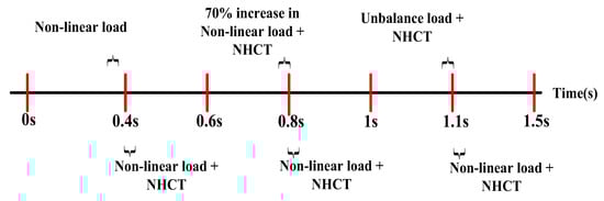 The load variation time duration in case-2 is like case-1. The total operation of the proposed approach is illustrated in Figure 7. As shown in Figure 7, during 0–0.4 s, the system is operated with no controller. During 0.4–0.6 s, the system performance is tested by using both non-linear and proposed NHCT controllers. In 0.6–0.8 s, the system performance is tested by using a 70% increase in non-linear load and an NHCT controller. During 0.8–1 s, the system performance is tested using both non-linear load NHCT controllers. Finally, during 1–1.1 s, the system performance is studied by unbalancing the load and using an NHCT controller. Finally, during 1.1–1.5 s, the proposed system is tested by using both non-linear load and an NHCT controller. The conventional controller may work efficiently during linear grid voltage and constant balanced load applications. However, in this test condition, for showing the better performance of the proposed NHCT approach over the conventional instantaneous power theory approach, the test condition is planned and tested during distorted grid voltage and a change in non-linear load conditions.