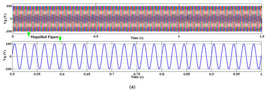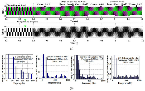 In the proposed approach, using the NHCT approach, the performance of the non-linear/unbalanced-based undertaken system is tested. From the study, it is found that the 34W VSI injects the required harmonics into the system to mitigate the harmonics. Due to the application of the NHCT approach, the grid current harmonics of the grid current are reduced significantly, as illustrated in Figure 10a. Figure 10a shows that the magnitude of the currents is changed according to the load requirement. For a clear vision of the grid current results, the magnified figure is also presented.