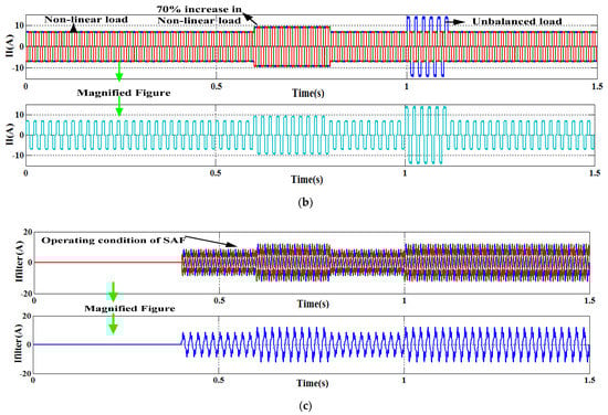 Due to the non-linear load, Figure 8a shows that the grid voltage becomes non-linear. A magnified figure is also presented with the original figure for a clear version of Figure 8a. In addition to that, the designed non-linear and unbalanced load model also produces non-linear and unstable current results, as illustrated in Figure 8b. As per the set condition, Figure 8b shows that, during 0–0.6 s, the designed load produces a constant non-linear load current. From 0.6 to 0.8 s, the non-linear load current result suddenly increases to 70% from its rated condition, and at 0.8–1 s, the non-linear load current decreases to its rated limit. To show the transient performance of the proposed controller, the non-linear load is changed to an unbalanced load for a duration of 1–1.1 s, and after 1.1 s, it is changed to a non-linear load and maintains its rated limit. The related variations are stated in Figure 8b. The proposed NHCT tracks the real conditions of the grid voltage and non-linear/unbalanced load condition and generates the harmonic current from the 3φ4W VSI to mitigate the nonlinearity present in the system. The required filter current for harmonic elimination is illustrated in Figure 8c. From the obtained results, it is visualized that the proposed 3φ4W VSI is well capable of producing the required current during variable non-linear and unbalanced load conditions.