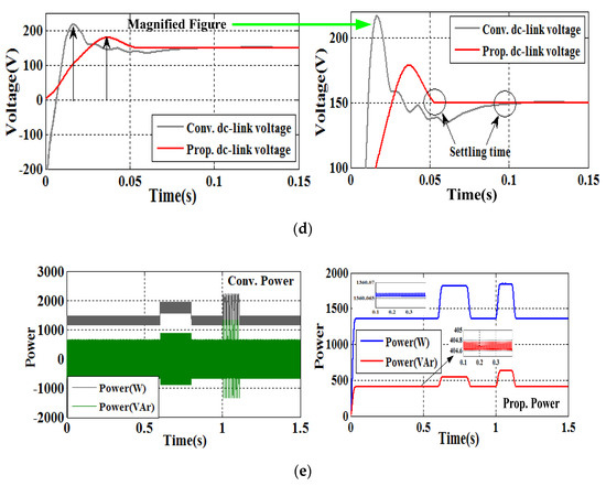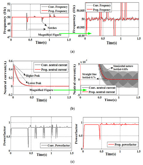For better justification of the proposed control approach in comparison to conventional P-Q-R strategies, a few comparative results are presented in Figure 11a–e. The magnified version of Figure 11a,b,d is illustrated on the right side of the given figure. Figure 11a shows that, by using both conventional and proposed approaches, the frequency of the operating system is 50 Hz. However, during the load change condition, the notches or settling time of the frequency are higher than the conventional approach. The magnified version of Figure 11a indicates that the frequency response is quite distorted during the traditional procedure compared to the proposed method. Figure 11b shows the neutral current figures obtained during both the conventional and proposed approaches. Using the proposed approach, the neutral current is reduced to a significant value, by which the circulating current and harmonic contained are decreased significantly. Figure 11c shows the results of both power factor (pf) values during both conventional and proposed approaches. Figure 11c indicates that by using the traditional method, the pf of the test system is computed as 0.81. However, Figure 11c suggests that, by using the proposed approach, the pf of the test system is calculated as 0.92. Thus, the spikes produced in the pf results during the sudden load change are more during the conventional approach. In this proposed approach, the dc-link voltage of the converter is regulated and compared with the traditional dc-link voltage, as illustrated in Figure 11d. Figure 11d shows that the peak overshoot and undershoot values of the dc-link voltage are more with the conventional result than with the proposed approach result. Therefore, to settle the dc-link voltage, the traditional approach takes more time than the proposed approach. The magnified version of Figure 11d clearly illustrates that the proposed method provides faster settling time as compared to traditional method. Figure 11e shows the active and reactive power results of the proposed and conventional approaches. By using the traditional approach, Figure 11e shows that the active and reactive power results contain both average and oscillating components.