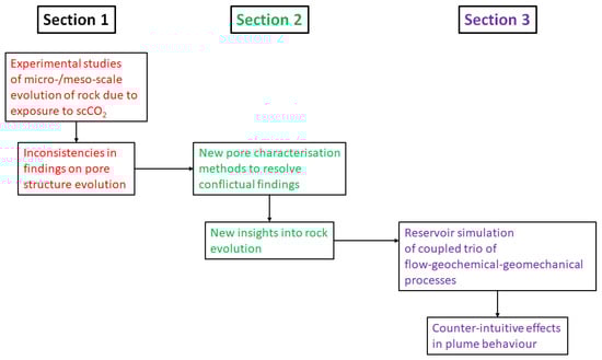 Therefore, this review was constructed in three main sections, with the first two considering pore- and core-scale phenomena, and the third section examining reservoir-scale phenomena. The first section describes work on the interactions of scCO2 with rocks, with special emphasis on the evolution of the pore structure. The second section describes new rock core characterisation methods and how they can resolve the issues highlighted in the first section. The third section considers reservoir-scale work.