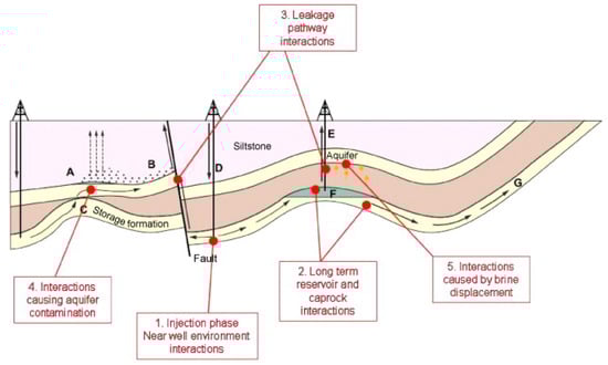 One of the major causes of global warming is the excessive emission and accumulation of greenhouse gases in the atmosphere, especially carbon dioxide (CO2). One of the methods to control the increase in global temperature is CO2 storage in subsurface geological formations. This method has been in practice since the early 1970s [1]. Knowledge concerning mature technologies has been gained from the injection and storage of CO2 from many existing enhanced oil recovery and acid gas projects [2,3]. In addition, several commercial sequestration projects are functioning nowadays, such as the Sleipner, Weyburn, and In Salah projects, and these indicate that it is feasible to store CO2 in geological formations as a promising solution for reducing CO2 emissions to the atmosphere [4]. The geological formation should have certain characteristics, including that the depth should be greater than 800 m below the ground surface, with acceptable porosity and permeability to store a significant amount of CO2. Additionally, for the CO2 to be stored safely for thousands of years, it is necessary for the storage formation to have an overlying impermeable confining layer, commonly referred to as caprock or seal. The main geological storage units that have the aforementioned features are depleted oil and gas reservoirs and, in addition, deep saline formations [5].